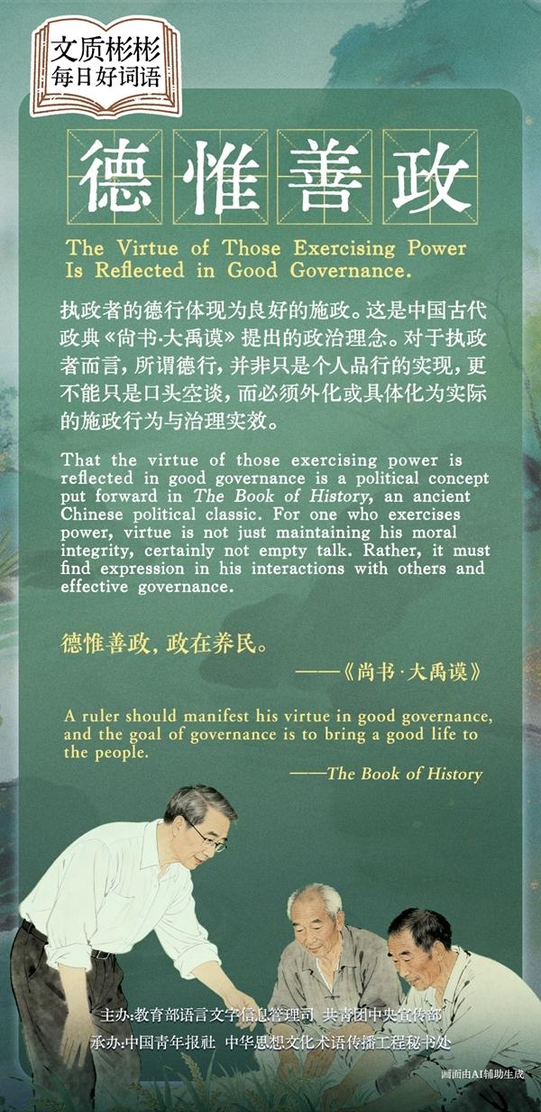 That the virtue of those exercising power is reflected in good governance is a political concept put forward in The Book of History, an ancient Chinese political classic. For one who exercises power, virtue is not just maintaining his moral integrity, certainly not empty talk. Rather, it must find expression in his interactions with others and effective governance.