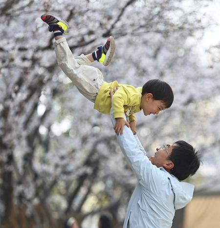 3月29日,在浙江省嘉兴市南湖区一家工厂的樱花园内,市民赏樱休闲度过愉快周末。金鹏/摄(新华社发)