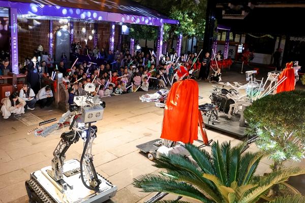 4月1日,安徽休宁,休宁县状元博物馆举办机器人乐队科技音乐秀,智能机器人现场演奏,吸引众多市民前来打卡,感受科技与文旅融合的新体验。视觉中国供图