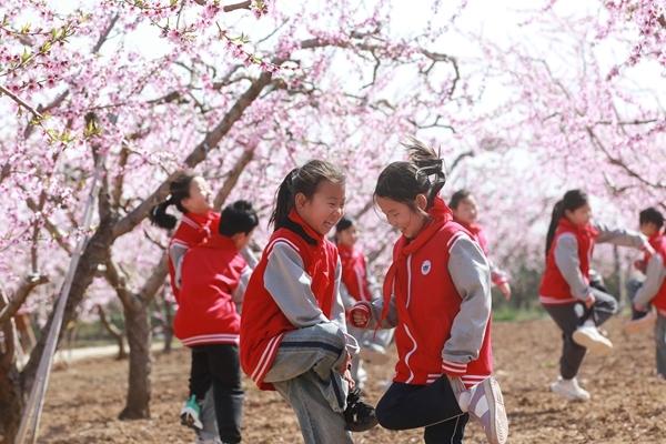 4月8日,山东高密,东流口子小学将课堂搬进校园周边桃林,老师带着学生在林间赏桃花、追跑嬉戏、临摹花影、了解农事,让孩子们感受大自然的魅力。视觉中国供图