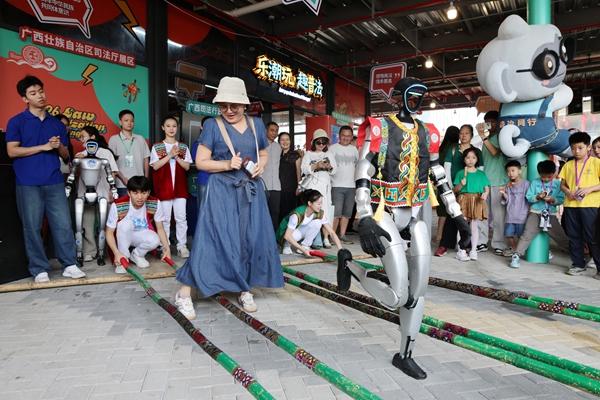 4月18日,广西南宁市民歌湖畔,数智节拍·人机共舞竹竿秀给游客带来不一样的体验。