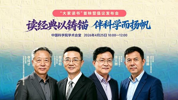 首个“全民阅读活动周”期间,由中国科学院学部工作局、共青团中央宣传部联合主办,中国科学院计算机网络信息中心承办的“大家读书”首映暨倡议发布会,将于4月25日在中国科学院学术会堂举行。活动以“读经典以铸锚 伴科学而扬帆”为主题,汇聚院士专家、青年代表及社会各界人士,共同搭建科学与阅读的对话平台,推动全民阅读走向深入,凝聚崇尚科学、热爱阅读的社会共识。